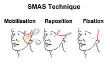The technique of a SMAS facelift, consisting of mobilization, repositioning and fixating.